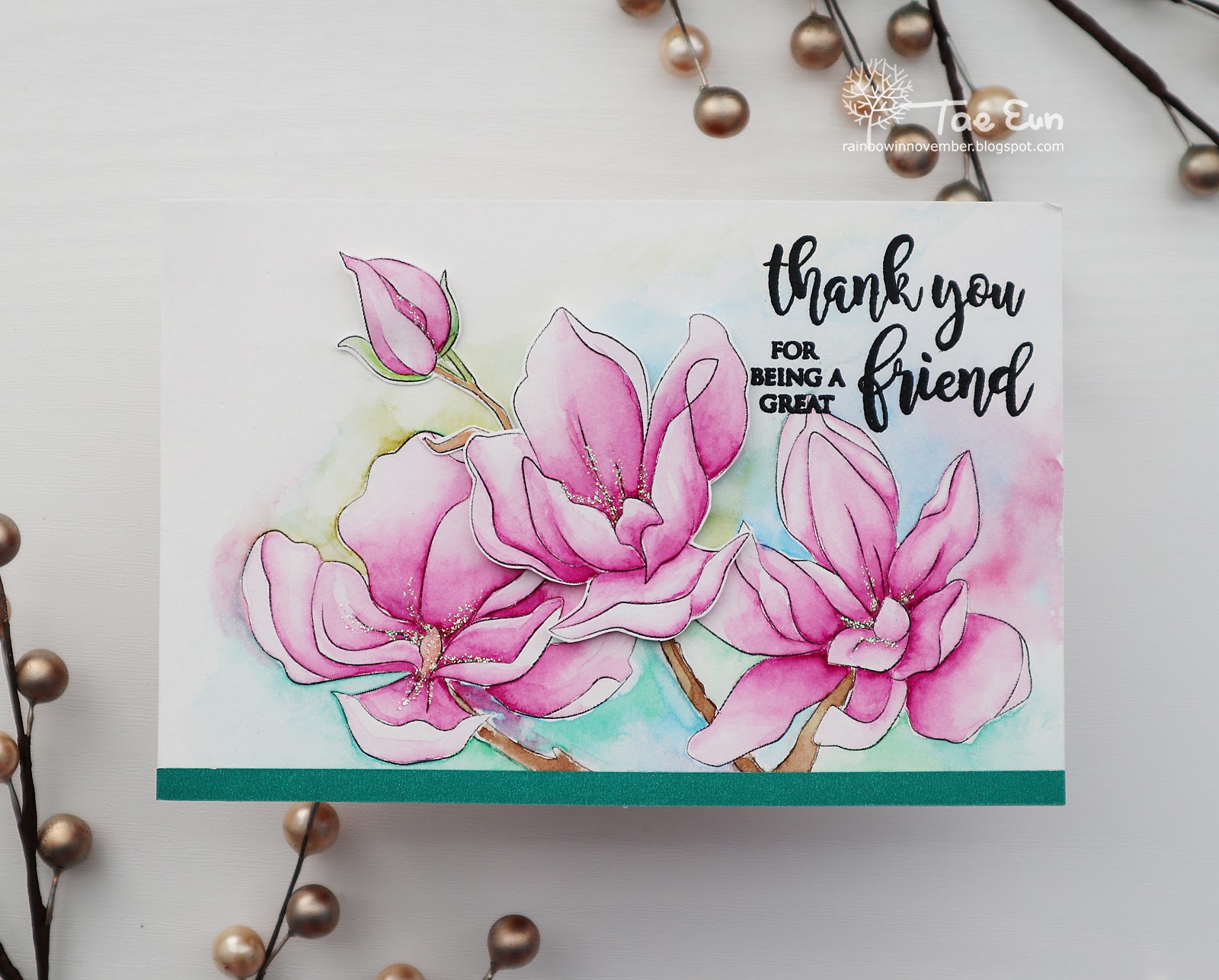 Two beautifully coloured cards TaeEun featuring Eunkji's wonderful Magnolias. I love the contrast between the white and the cut away part on the left which reveals the brown under layer, and the second with the pretty group of flowers and love the green shimmer paper at the bottom and the pretty soft blue and green in the background, and I adore that sentiment too. x