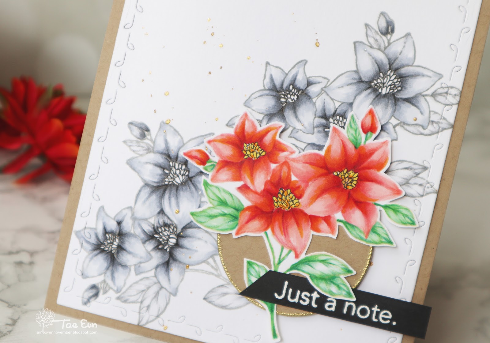 I stamped the floral cluster two times on a white cardstock panel in gray Memento ink. I colored the image using C Copic colors and added details using Polychromos pencils also in cool gray. I then splattered gold watercolor on the panel and let it dry.
