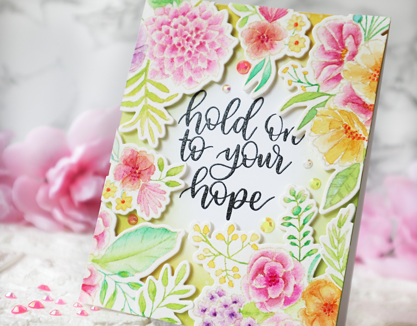 I arranged the die cut floral clusters to fill the border of the card adhering them using some foam adhesives. I finished off the card with some pretty Jewels from Jewels Mix, my favorite embellishment at the moment 🙂! They are so pretty!